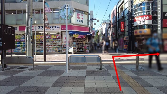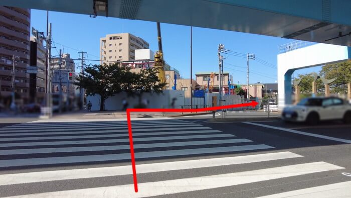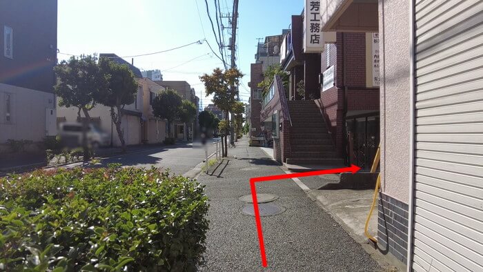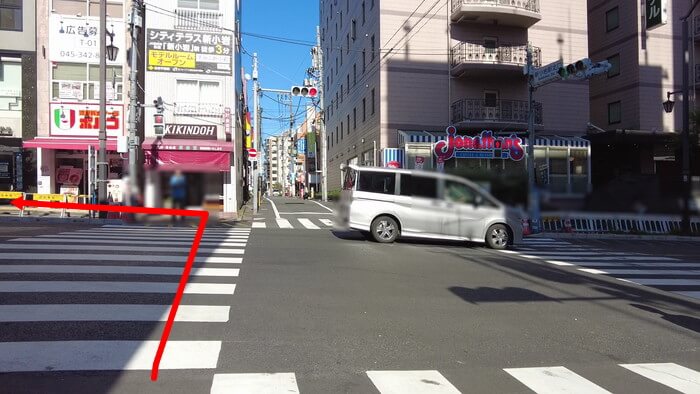 平和橋通りと蔵前橋通りが接する大きい交差点に来たら、横断歩道を渡り右斜めの小道を進みます。